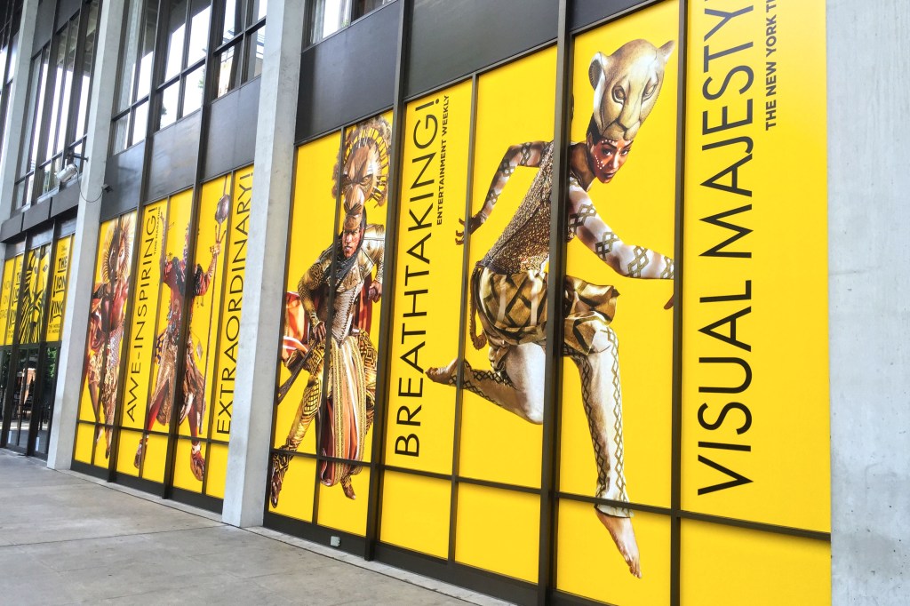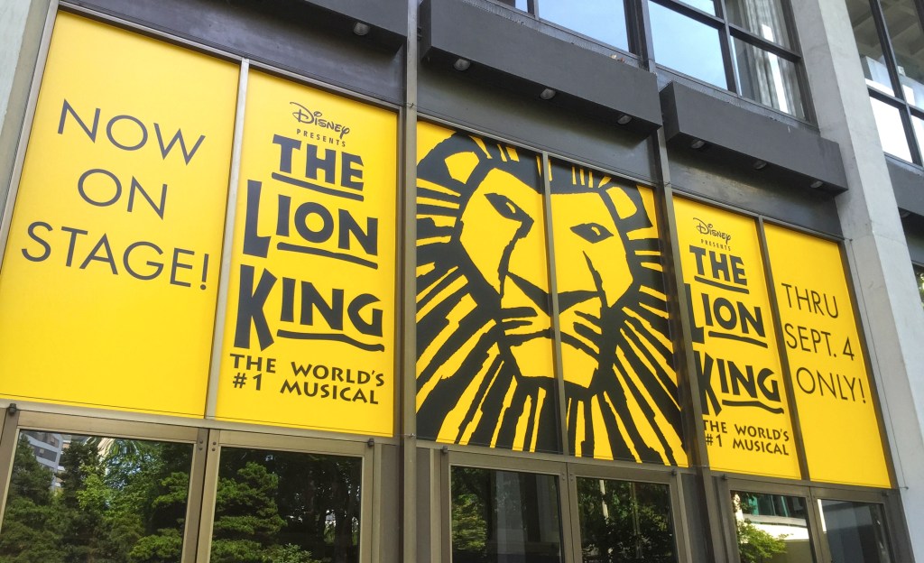 Closer, the typography takes over. “Now on stage.” “The Lion King.” The words are direct, almost flat compared to the images beside them. But that contrast holds. It grounds the spectacle just enough to keep it from feeling distant or untouchable. This is not an idea of a performance—it is happening, here, now, in the middle of the day.