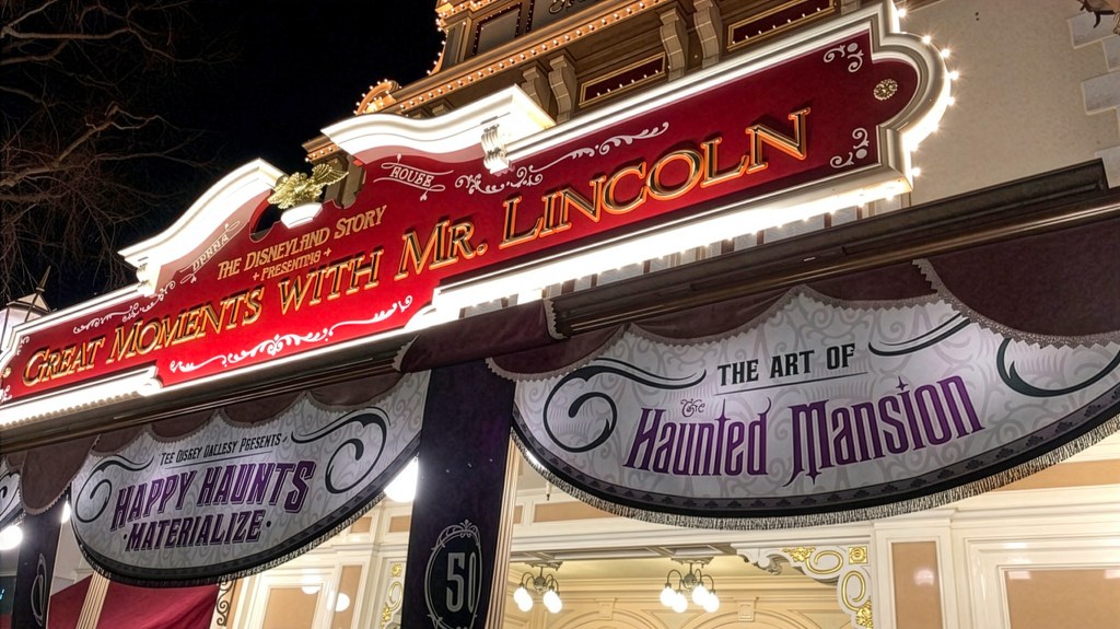 On Main Street, the Haunted Mansion is presented outside of itself. At the Opera House, The Art of the Haunted Mansion places elements of the attraction in open view—lit, labeled, and separated from the environment that normally contains them.