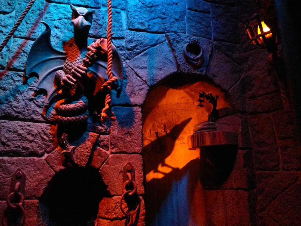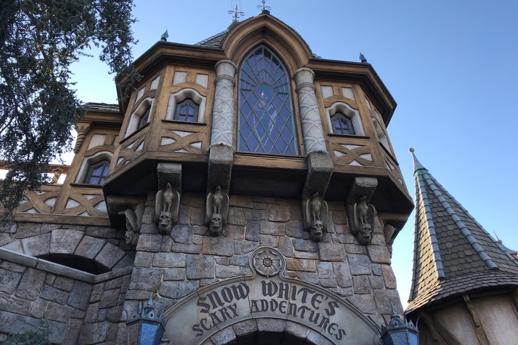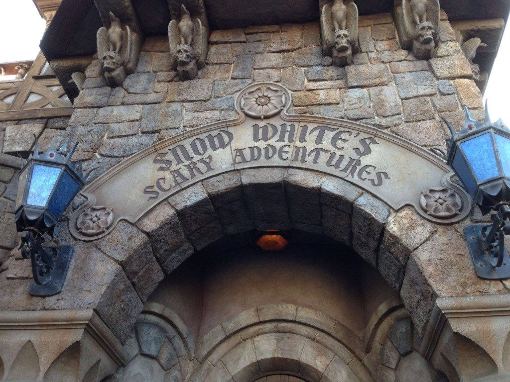 But the moment we step into the queue for Snow White’s Scary Adventures the atmosphere changes. The walls are stone. The light is dimmer here, more shadow than sunlight.