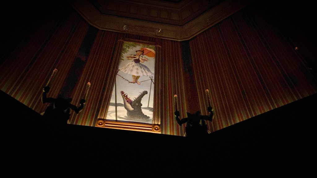 Beyond the room, the house unfolds in scenes—voices behind doors, a séance, a gathering, a solitary figure, a chorus. You are seated, the bar lowered for you, and from that point forward, your movement is no longer your own. You are turned, slowed, directed—shown what is meant to be seen. The house darkens, and what appears does so only within the light.