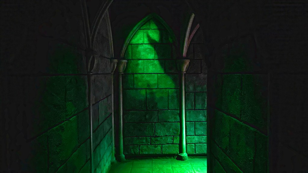 Maleficent does not need to appear as a figure to dominate the space. Her presence is reduced, then displaced, and finally absorbed into the environment. By the end, she is no longer encountered directly. She remains as light—flattened against the wall, recognizable only as a silhouette held in green.