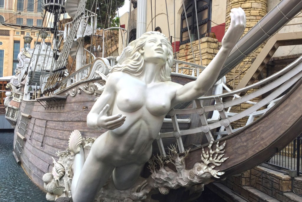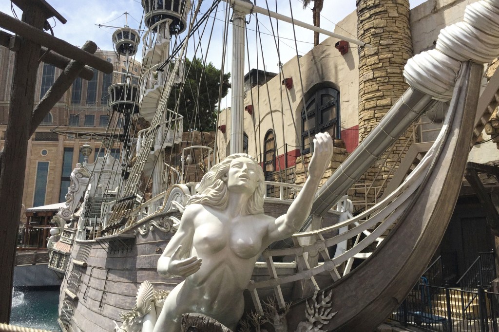 For a decade, this structure functioned as the primary stage for Sirens of TI, a free outdoor performance staged along the Las Vegas Strip. Two ships occupied the space—one naval, one pirate—but the narrative centered on a crew of women whose presence was defined through choreography, music, and spectacle. The environment was designed for movement, sound, and controlled illusion.