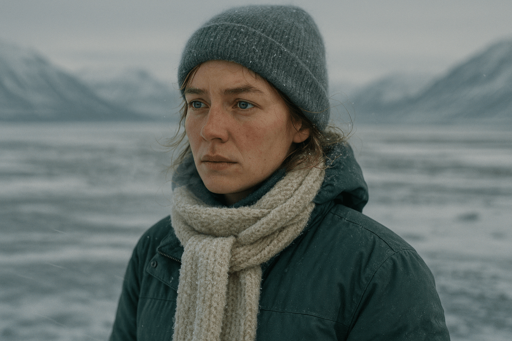 A24 LUMICORE V3 — ASTRID BJØRNSEN (FINAL FILM STILL PASS) Definitive Horizontal Cinematic Still — 50mm Lens, Arctic Realism Locked This is the final, fully refined cinematic still of Astrid Bjørnsen, a Norwegian Svalbard-born field researcher in her early 30s. Preserve all V1 and V2 identity, wardrobe, atmospheric, cultural, and environmental locks while enhancing realism, lens fidelity, lighting behavior, and emotional subtlety to film-level authenticity. Astrid stands in the polar desert of Svalbard under a heavy, muted Arctic sky. Her wind-burned cheeks, uneven winter flush, and cold-reddened nose show natural texture and micro-imperfections. Her blue eyes remain realistic—slightly tired, slightly narrowed against the wind. Her blonde hair, tied in a functional braid, now shows more ice-crystal scatter, tiny shards catching ambient light, with loose strands moving irregularly in the gusts. The parka’s fur trim is denser with rime frost; individual hairs clump with ice, not uniformly. Her expedition coat shows weather staining, compressed fibers, and frost melt patterns near the collar. Add subtle condensation softening the edges around her breath vapor. Increase environmental fidelity: — The loaded wooden sled behind her is partially buried in drifted snow, edges softened by wind-carved shapes. — Rope fibers show frost, rough texture, and tiny ice granules. — Distant mountains sit behind atmospheric depth layers, with subtle tonal separation (soft bluish haze, low contrast). — Snow surface shows irregular sastrugi and micro-shadows from wind ripples. Lighting is pure Arctic overcast: diffuse grey light with no hard shadows. Introduce cinematic light falloff along her coat and face, emphasizing realism rather than stylization. Camera language: Shot on a physical 50mm lens, eye-level, slight off-center composition. Introduce natural lens artifacts: — mild chromatic micro-fringing along high-contrast edges — faint halation around brighter snow patches — subtle gate weave feel (A24 aesthetic) — soft grain distributed unevenly, especially in shadows Color palette: very muted Scandinavian tones — grey, blue, charcoal, earth, cold neutrals. Zero artificial saturation. Mood: a quiet, weather-hardened resolve; Norwegian emotional restraint; the look of someone who understands the land and moves with its terms. No dramatics, no posing — just a moment captured mid-breath in real Svalbard conditions. Absolutely no stylization, no smoothness, no fantasy, no digital gloss. This must read as a true film still from a Norwegian Arctic drama.