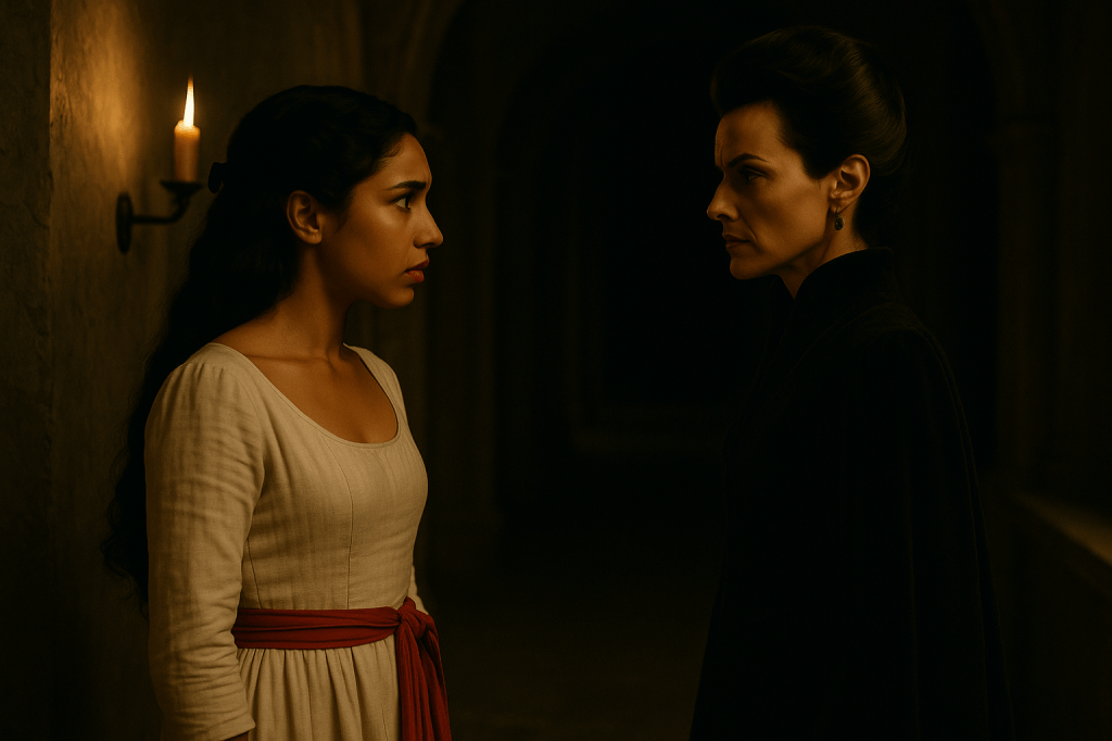 Her shadow arrives before her voice, long and dark against my wall, reaching for me like a hand. I do not know if it is the firelight bending against the stones or if she truly stands outside my door.