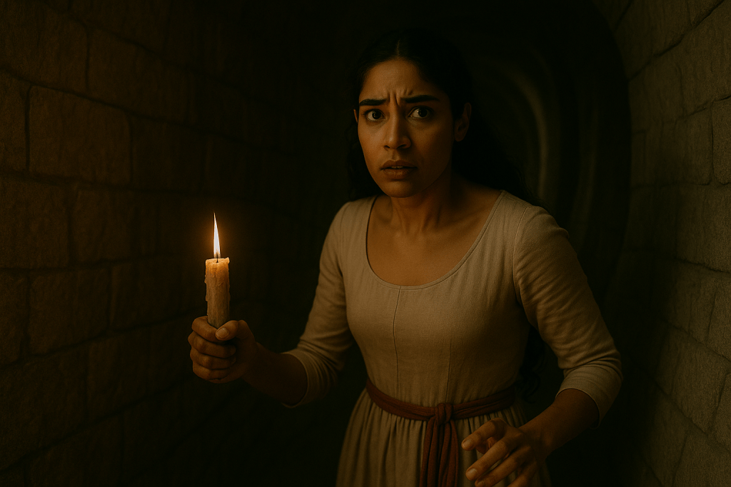 I clutch the candle tighter; hot wax spills across my hand. Pain blooms, small and human. I welcome it. I keep the flame alive. My breath fogs the air; the corridor seems to narrow to the width of my fear.