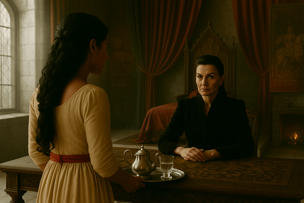 Her chamber is vast, suffocating in its splendor—stone walls drowned in velvet drapes, a hearth that burns but gives no warmth. Rugs drink the sound of my steps. Tapestries watch, full of battles no one won.
