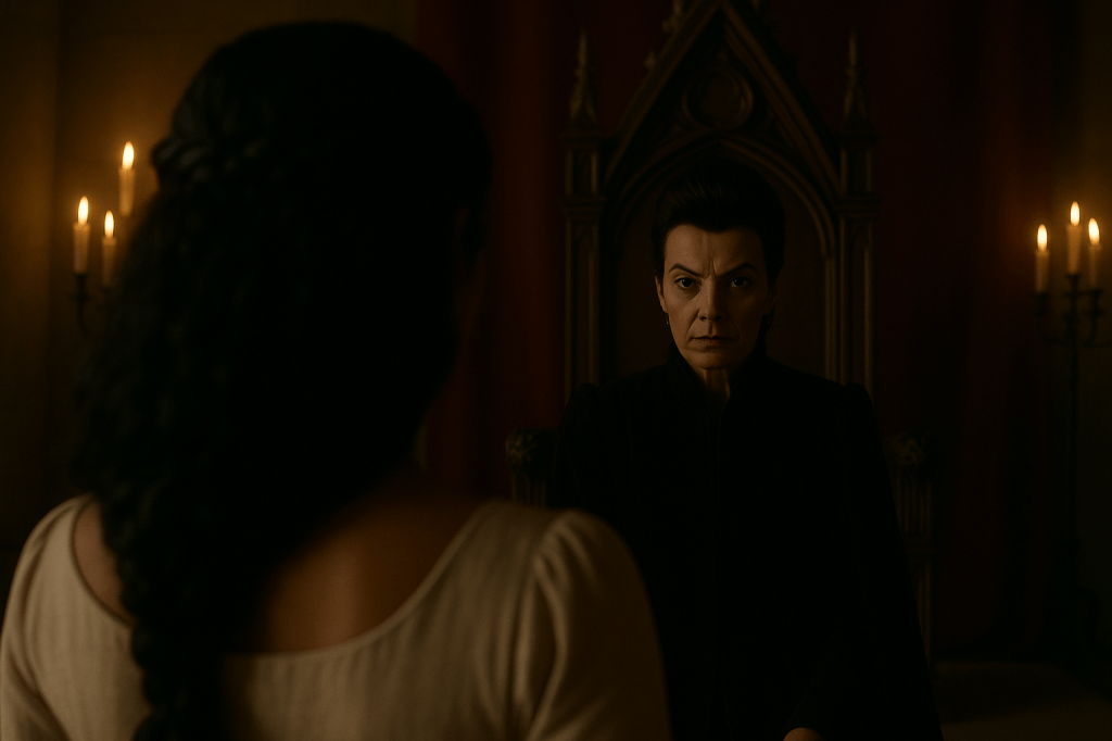 The Queen stumbles back from the mirror, her face flickering between a dozen selves—the lover, the mother, the mentor, the monarch—all unraveling. For a heartbeat her gaze softens, as if she sees in me the thing she lost before she learned to be cruel.