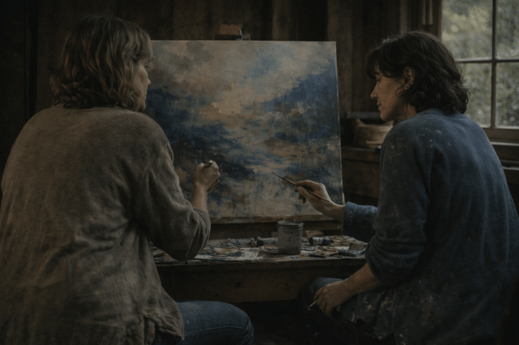 Our hands brushed as we reached for the same color. The touch lingered longer than necessary, a quiet spark passing between us. Elena’s gaze caught mine, deep and searching, and for that brief moment, the world beyond the cabin didn’t matter.