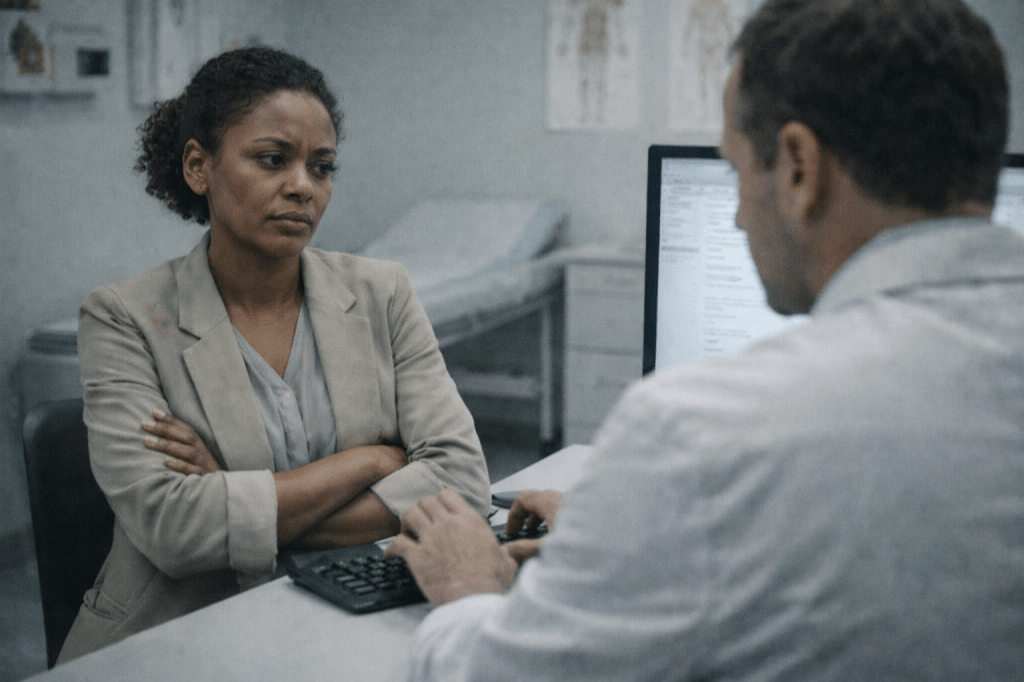 He sits behind his desk, typing as I explain what’s been happening — the bruises that appeared overnight, the tremors, the exhaustion that doesn’t go away. His eyes flick toward me occasionally, but most of his attention is on the screen.