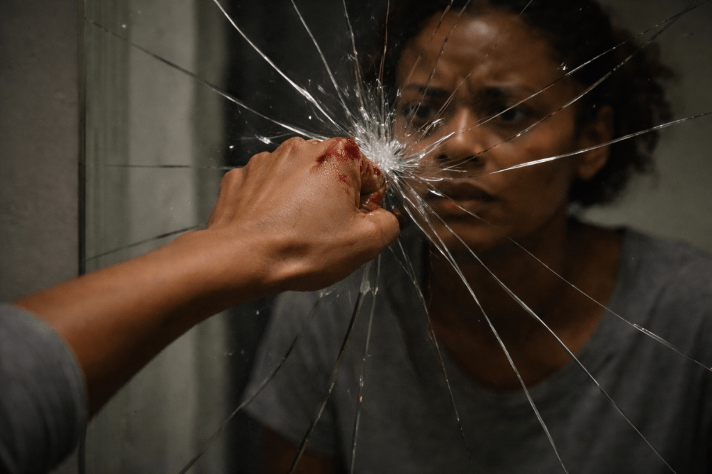 I stand in the middle of my apartment, blood dripping from my hands, but I’m steady. The bruises are fading now, retreating under my skin, but the memory of them lingers. I glance at the shards of glass on the floor and the broken mirror, and I’m no longer afraid of the fractures.
