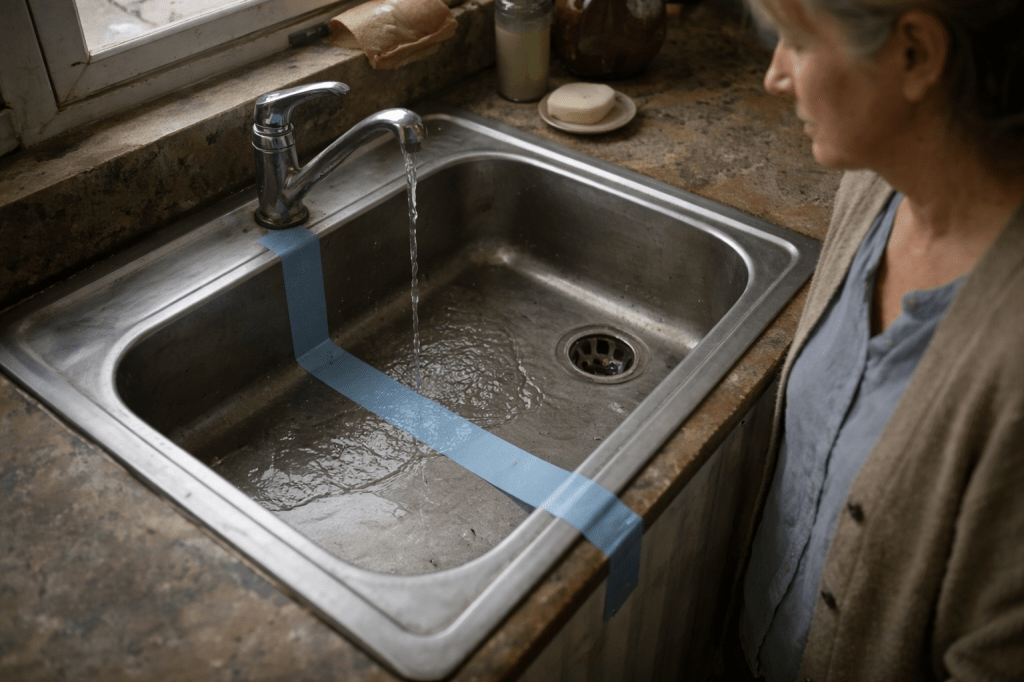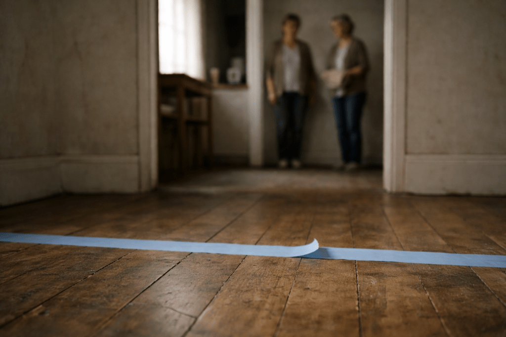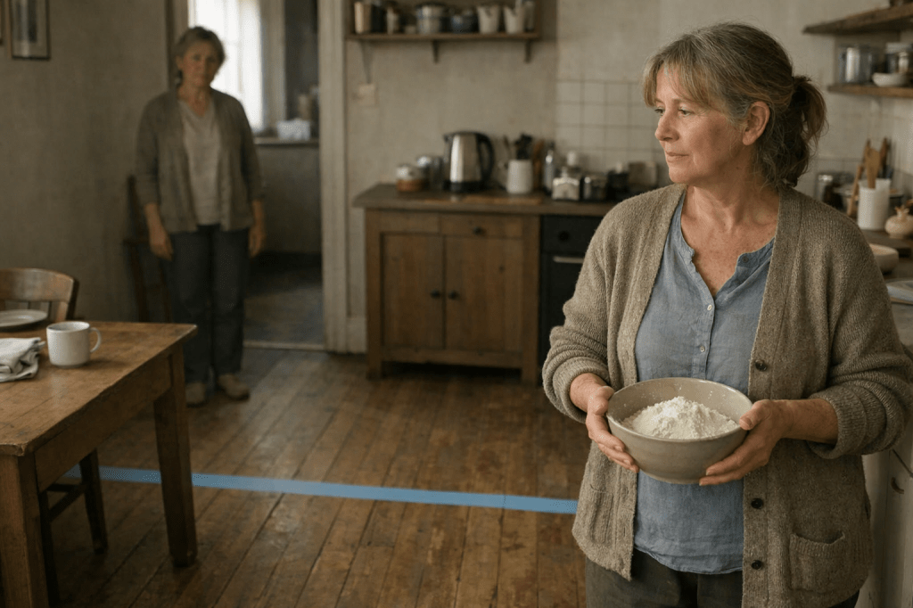 It ran straight across the kitchen floor, pale blue, pressed flat and confident. It passed under the table, between two chair legs, and continued toward the sink as if it had been given instructions and followed them exactly. I stood there with the flour still in my hand, trying to remember whether we owned tape like that.