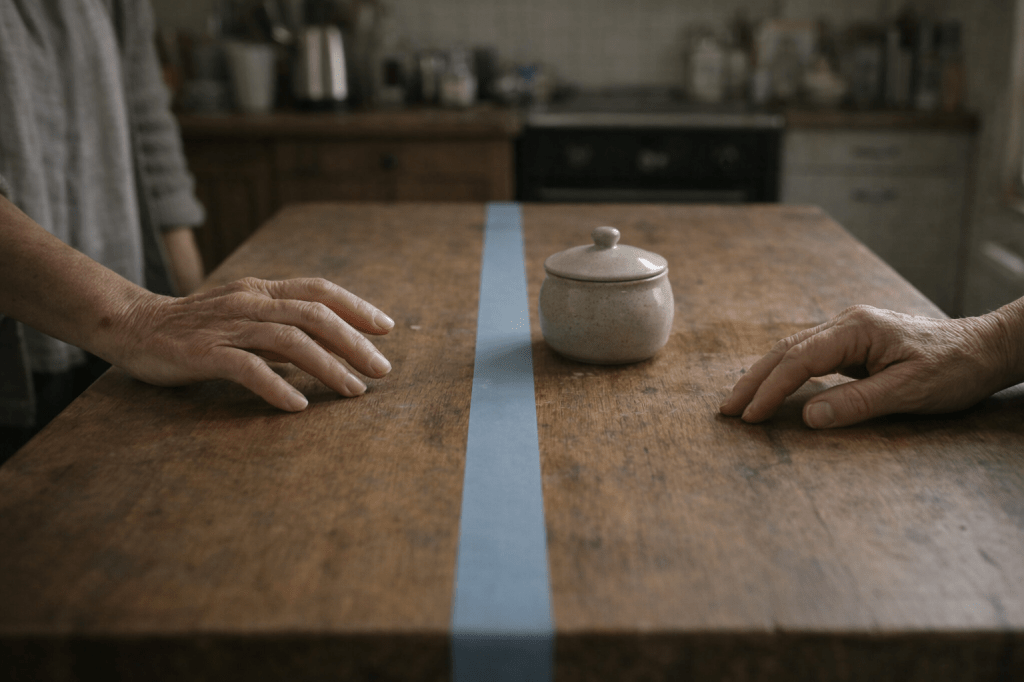At the sink, the tape cut the basin in half. The faucet was hers. The drain was mine.