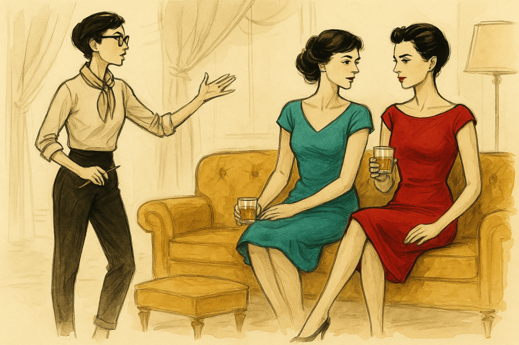 The illustration reframes Dial M not as a thriller of male orchestration but as a production sculpted by women’s voices. The staging hand is female; the story belongs to its actresses. What might have been rendered as spectacle becomes a rehearsal of power — collaboration, listening, trust.