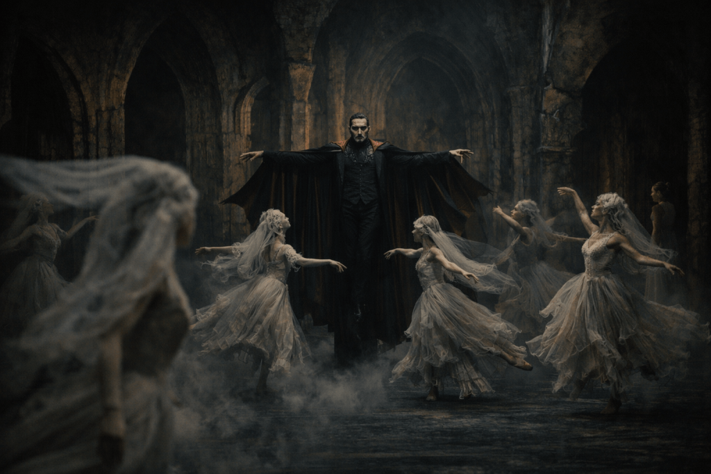 Archival Preface: The Dance of Shadows: Ballet strips the myth to its bones: desire, surrender, immortality, and the choreography between them. Where the “Dracula” play offered wit and dialogue, the ballet offers breath and silence — gestures that flicker like candlelight across the stage.