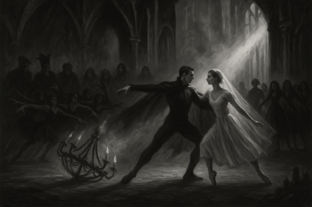 A monochromatic Expressionist-style painting captures the final act’s climactic pas de deux. Svetlana, now in a flowing bridal gown, confronts Dracula in a moment of haunting intimacy and resistance. Around them, the fallen chandelier, ghostly Brides, and shadowed villagers echo the chaos and loss of the preceding battle. Theatrical lighting slices through the gloom like a final blessing — or a blade of dawn.