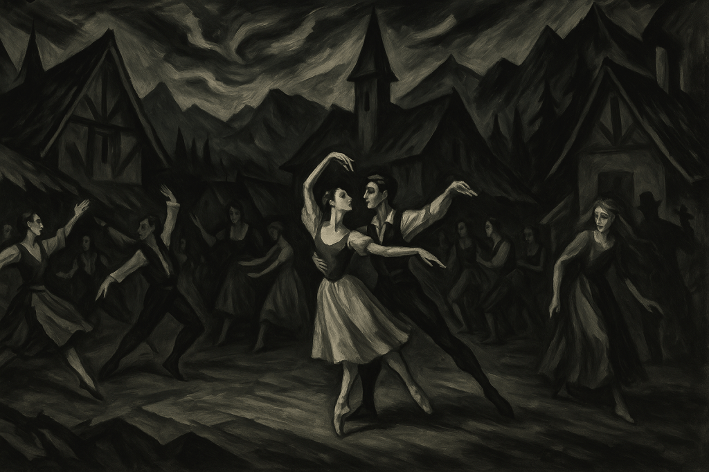 A stylized stage painting shows a joyous pas de deux between Svetlana and Frederick. Villagers dance in Eastern European costumes, but in the shadows, Flora appears ghostly and displaced, foreshadowing the storm to come.