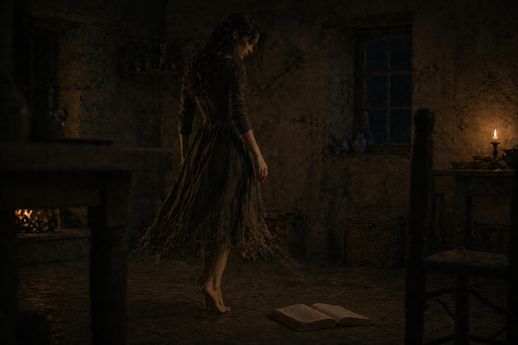 The room is quiet, save for the soft crackle of the dying fire and the faint rustle of pages as I turn them. The night presses against the cracked window, darkness broken only by the flicker of a single candle. Shadows dance across the rough walls—shifting, listening.