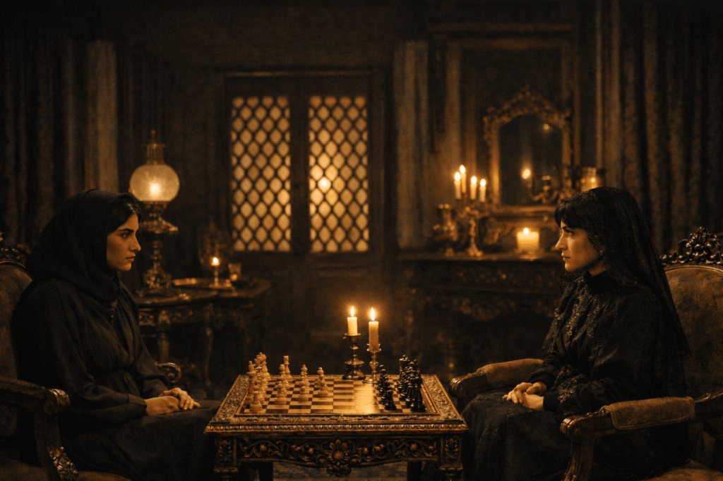 The atmosphere resembles less a traditional mystery than a slow, suffocating game of strategy. The title proves fitting. Characters drift through the mansion like pieces on an unseen board.