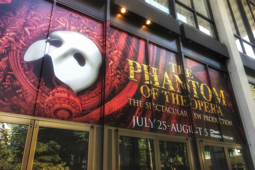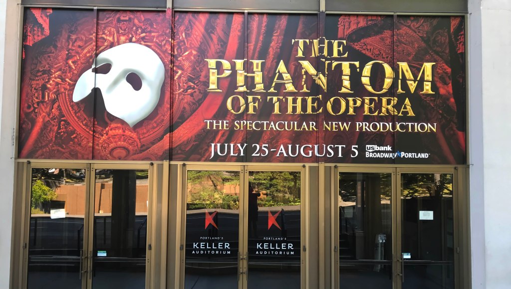 In July 2018, I attended a 2:00 PM matinee of The Phantom of the Opera at Keller Auditorium. Downtown Portland moved normally outside — summer light reflecting off glass towers, trees casting steady shadows along Main Street. Across Keller’s façade, however, the white half-mask stretched wide over molten red and baroque gold, announcing spectacle against the building’s clean geometry.