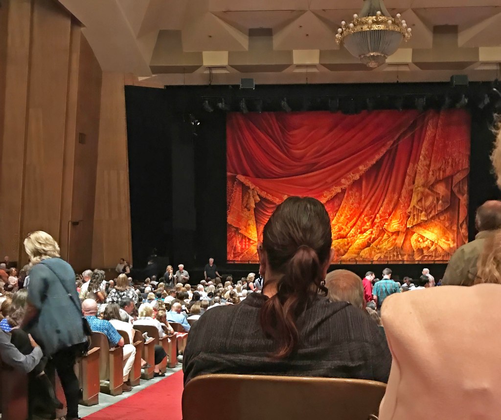 Matinees have their own rhythm — quieter, slightly reflective. Programs unfolded softly. Conversations hummed at a lower register than an evening crowd might carry. The red curtain glowed deeper than expected, absorbing rather than reflecting the ambient light.