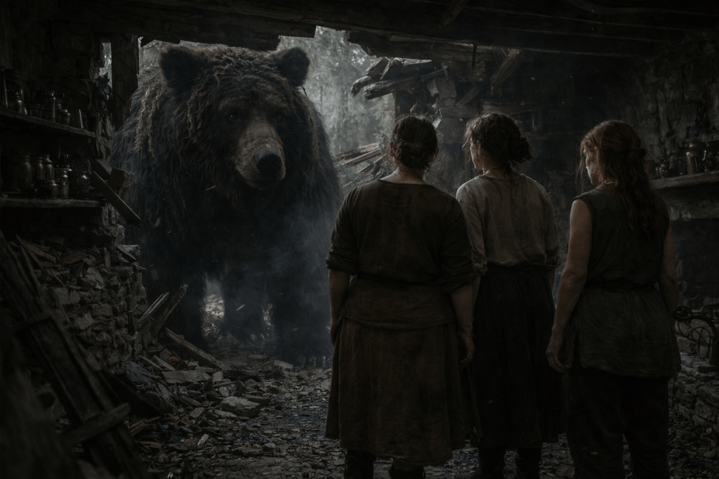 Ursa came through the ruin like a living hill—slow, inevitable, already inside the story before we understood she had entered it.
