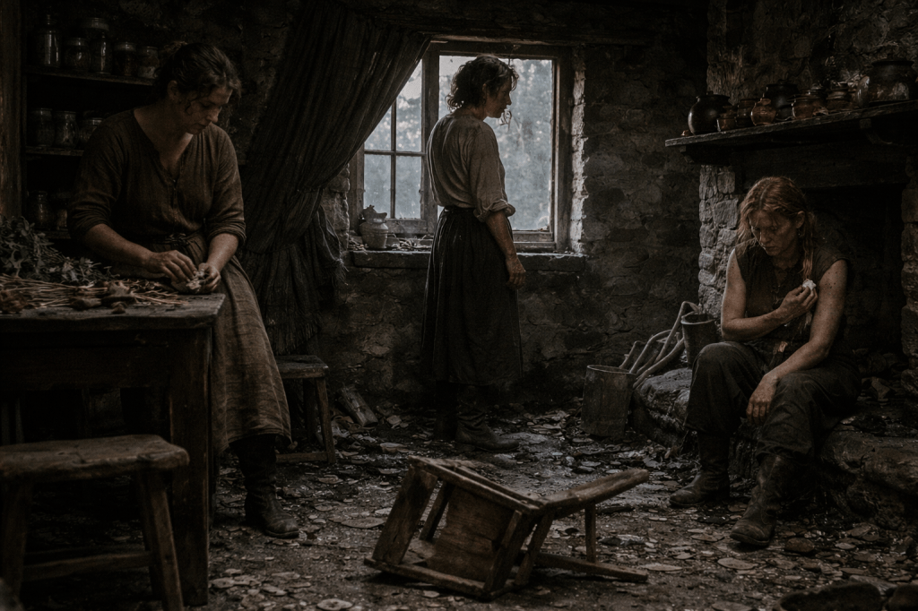 By dusk, the cottage no longer pretended to be whole. Chairs were gone, windows patched with spelllight and will. The door leaned inward like a tired mouth. Only the beds remained untouched—three narrow frames pushed together in the center of the room, quilts folded back, bare and waiting.