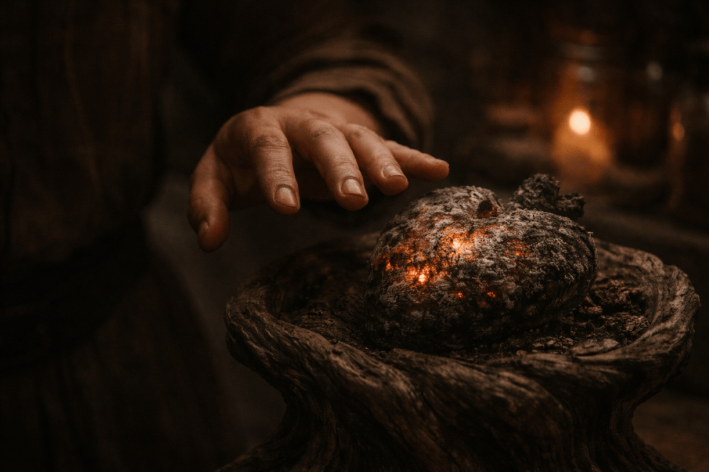 It sat on a low pedestal of twisted wood at the back of the room, glowing softly, like embers beneath ash. Not blazing. Not begging. Just waiting.