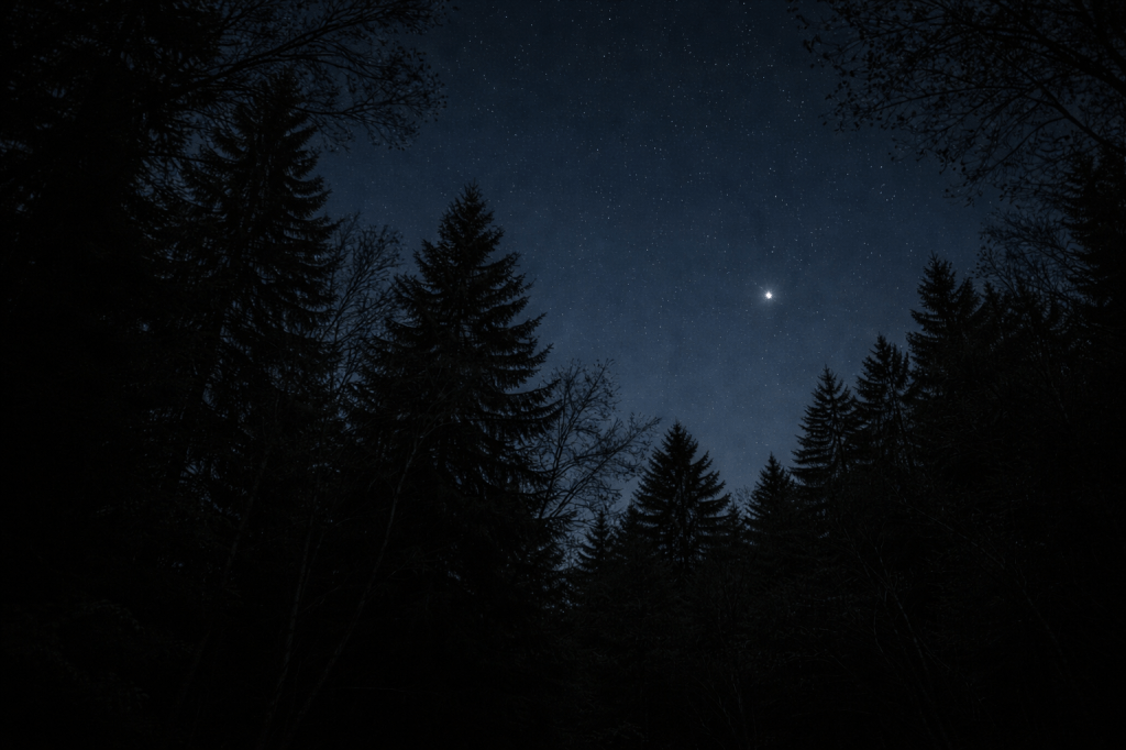 Far above the trees, a constellation shifted—one star burning where there had only been darkness before, the forest beneath it finally still.