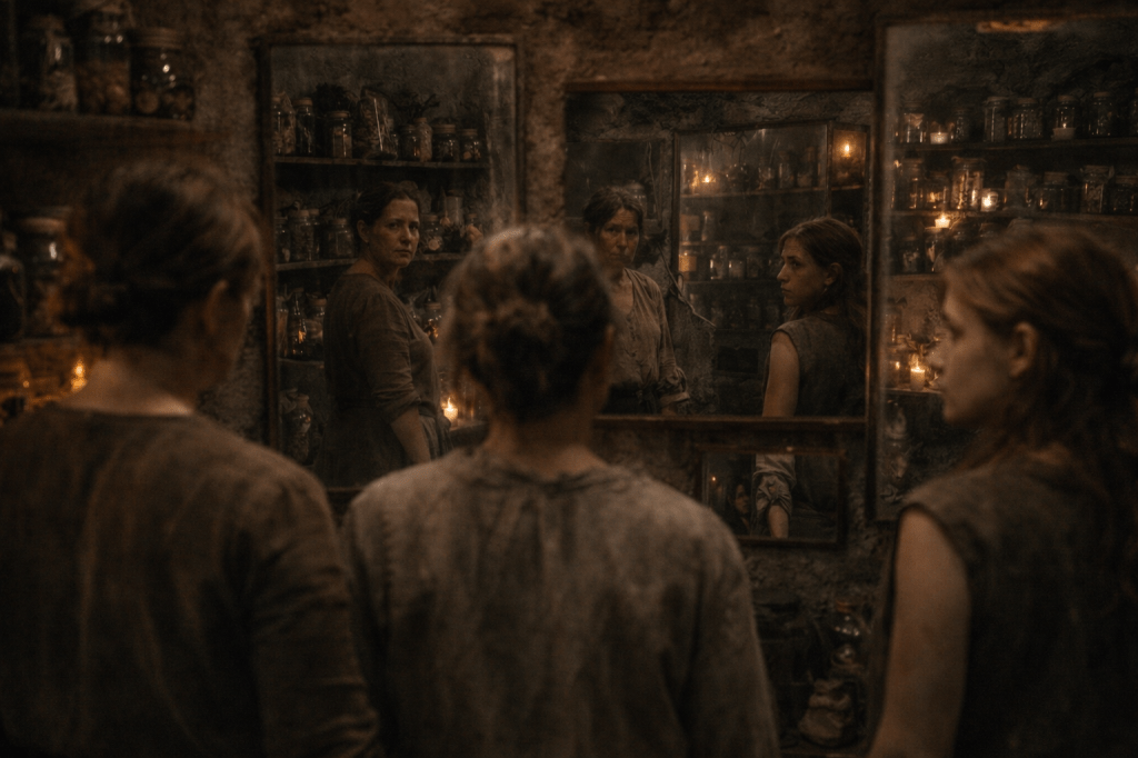 Shelves lined the walls, crowded with jars—roots, feathers, things that pulsed faintly when you looked too long. Mirrors hung everywhere, angled so no matter where you stood, you saw yourself from three directions—never alone, even when you wanted to be.