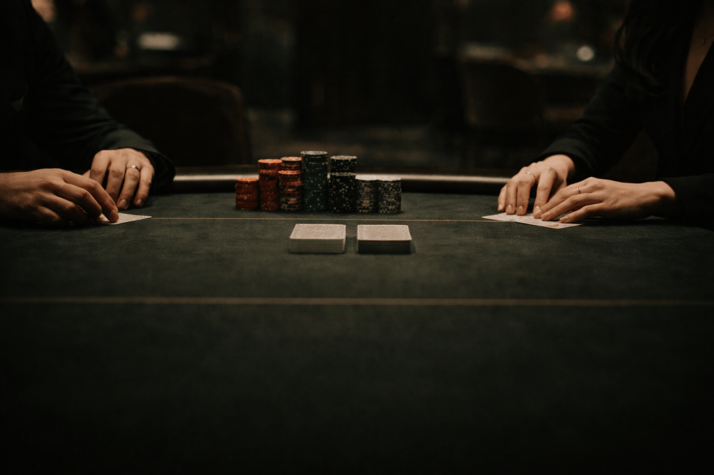 An opening bet is placed, modest enough to pass as polite, and I match it after a measured pause. The table responds in kind, each movement deliberate, each decision carrying just enough weight to matter.
