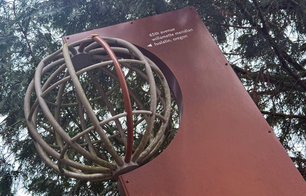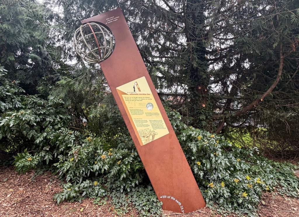 A leaning monument tucked among trees in Tualatin marks something that cannot actually be seen. The sculpture identifies the path of the Willamette Meridian, an invisible surveying line that helped shape land ownership across the Pacific Northwest. Though the line exists only on maps, it still runs quietly through the landscape beneath the park.
