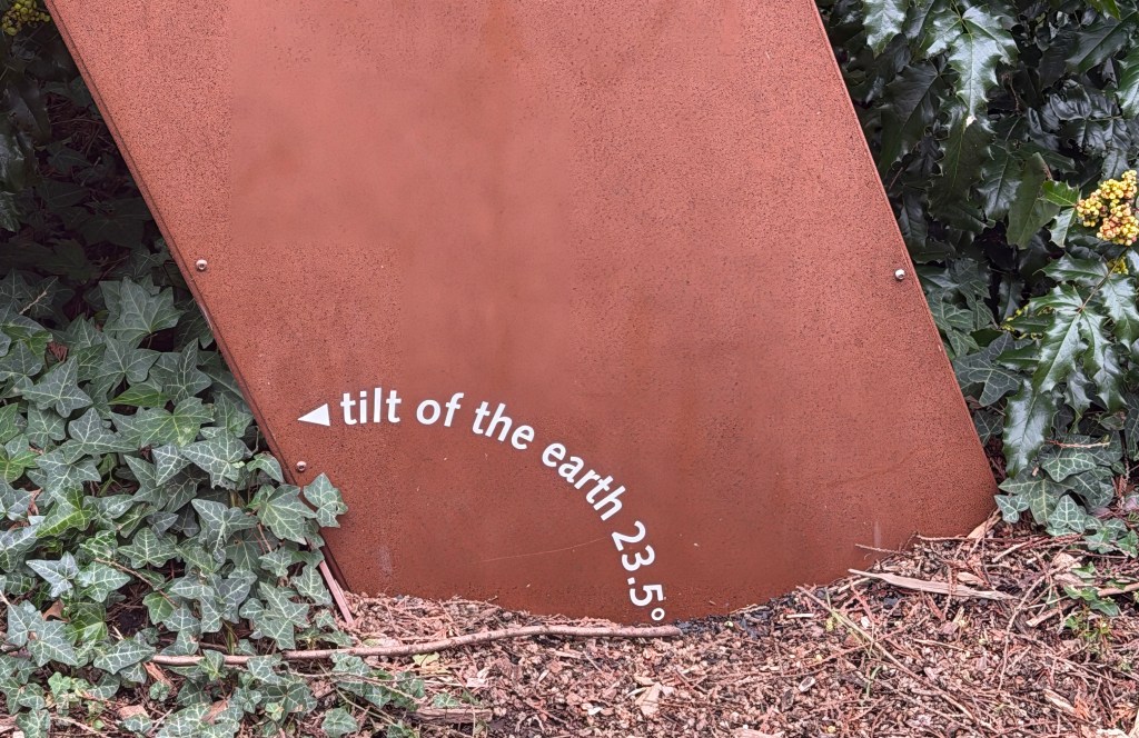 The monument stands near the path of 65th Avenue, which closely follows the meridian as it passes through the city. The structure tilts deliberately, referencing the 23.5° tilt of the Earth, while a metal globe at the top illustrates the concept of a meridian — a line stretching from the North Pole to the South Pole.