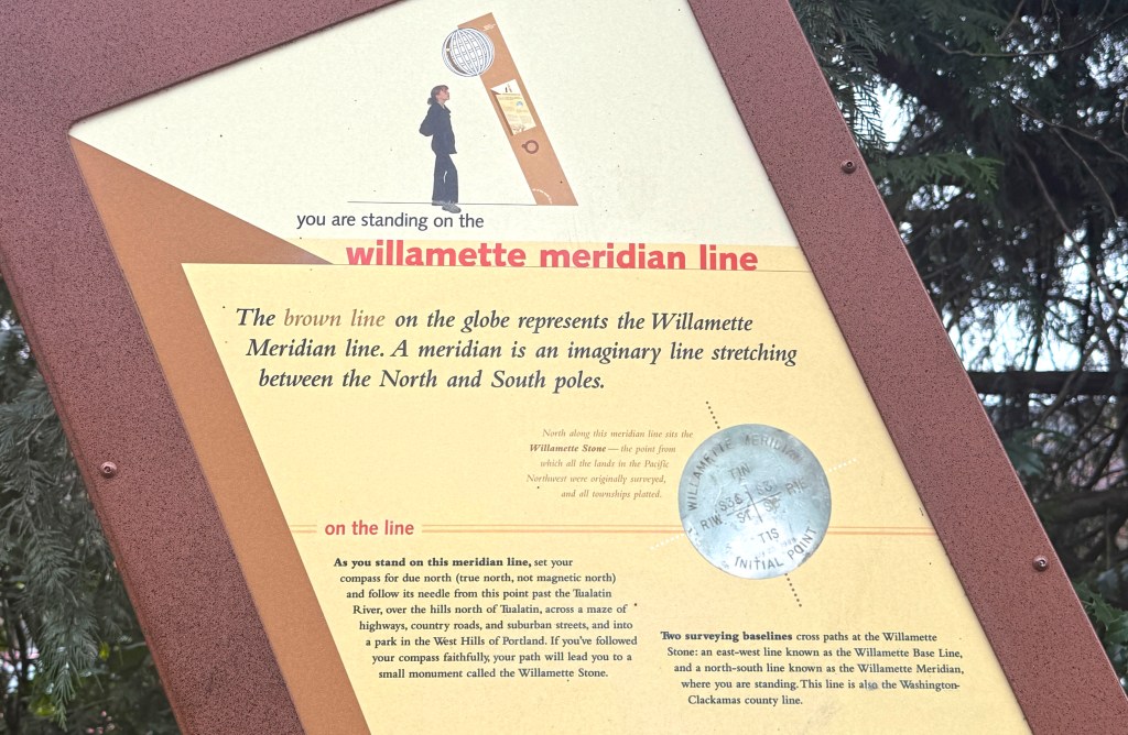 Interpretive panels explain that the Willamette Meridian was established in 1851 as part of the Public Land Survey System. Surveyors used the line, together with the east–west Willamette Base Line, to create a grid that divided land into townships and sections. Each township contained thirty-six sections of 640 acres each, forming the system that still underlies legal land descriptions today.