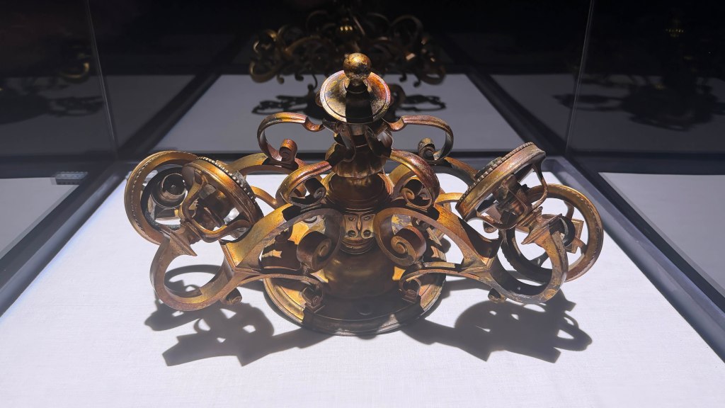 China. Glass. Metal. A chandelier preserved behind reflection.
