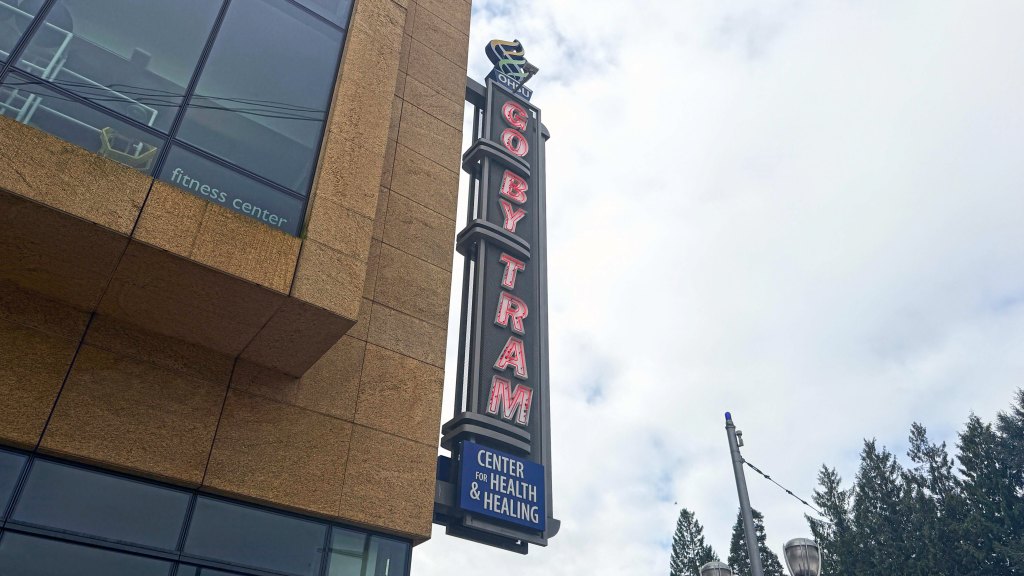 Vertical, assertive, built into the structure itself—it reads less like signage and more like orientation. A directive embedded in the architecture. Nearby, the red panel marks the threshold: portland aerial tram. Bold, unmistakable, almost civic in tone. This is where the crossing begins—not in motion, but in acknowledgment.