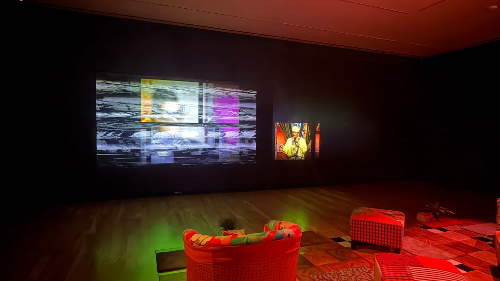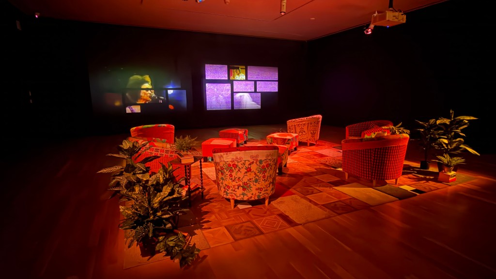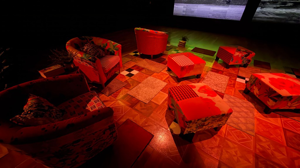 Chairs and ottomans form a loose circle across a patchwork of rugs. The arrangement suggests a place to sit, but not where or how. Screens flicker across the walls—fragmented images of performers appearing and dissolving before they can fully settle.