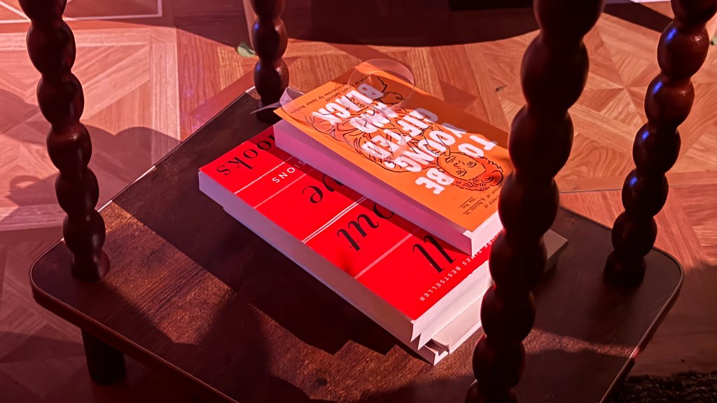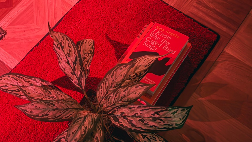 I Know Why the Caged Bird Sings appears beneath a plant, its cover interrupted but legible.