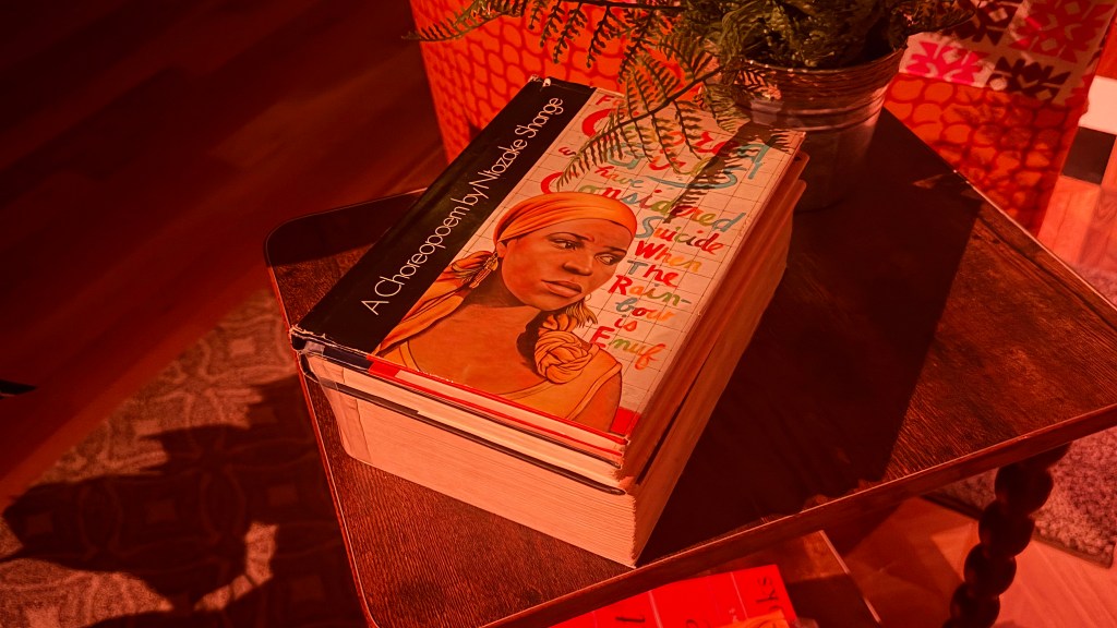 For Colored Girls Who Have Considered Suicide / When the Rainbow Is Enuf, The Women of Brewster Place, Roots—titles stacked together, visible from one angle, obscured from another.